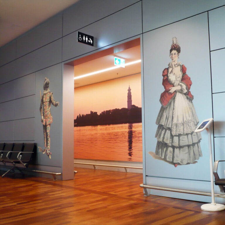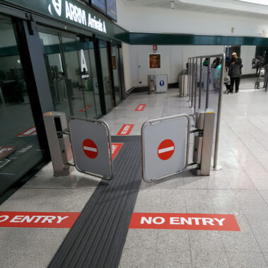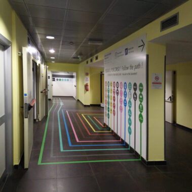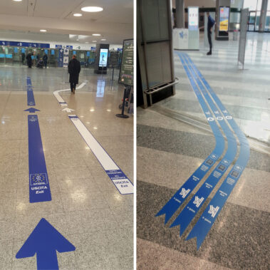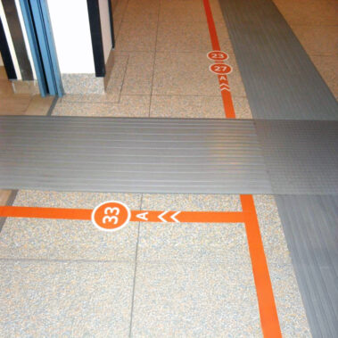 Si tratta di speciali adesivi personalizzati, progettati per essere applicati direttamente sul pavimento. Questi percorsi creano un vero e proprio “filo di Arianna” visivo che accompagna le persone senza incertezze fino alla meta desiderata.