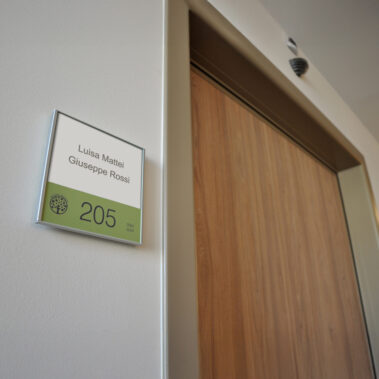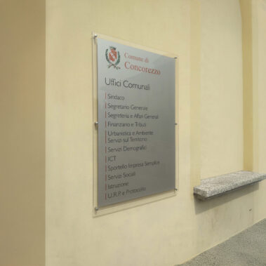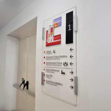 Lastre in plexiglass, inox, alluminio o dibond fissate distanziate dalla parete tramite classici distanziali cilindrici, per estetica minimalista dove il meccanismo di supporto diventa elemento di design, con massimo rispetto delle pareti, garantendo la possibilità di sostituzione della lastra.