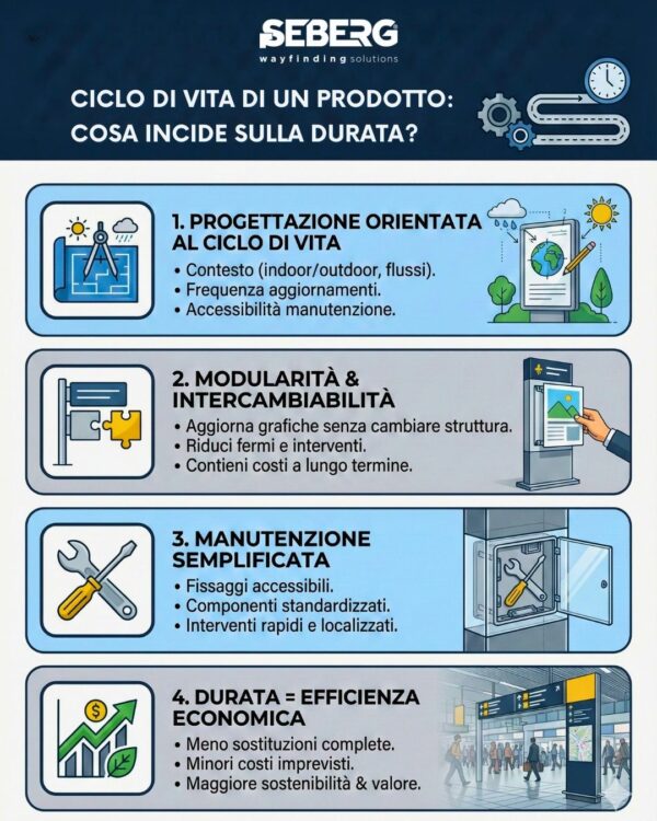 Nel wayfinding, la durata è il risultato di scelte precise: modularità, accessibilità ai componenti, possibilità di aggiornare i contenuti senza intervenire sulla struttura.